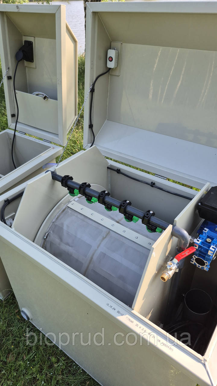 Головна перевага — автоматична система промивки. Коли барабан забруднюється, він автоматично починає обертатися, а форсунки обприскують його чистою водою, змиваючи сміття в спеціальний жолоб, який веде до накопичувальної ємності або компостника (опція). Це повністю автоматизований процес, що значно знижує участь людини у щоденному догляді за ставком.